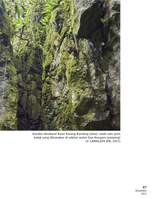 Kondisi eksokarst Karst Karang Kandang (atas), salah satu jenis katak yang ditemukan di sekitar mulut Gua Aseupan (samping) (© LAWALATA IPB, 2017) 47 Desember 2017