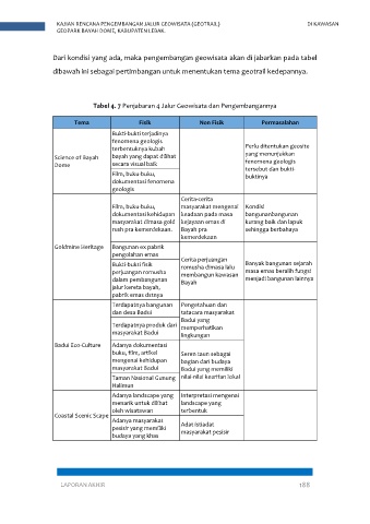 Dari kondisi yang ada, maka pengembangan geowisata akan di jabarkan pada tabel