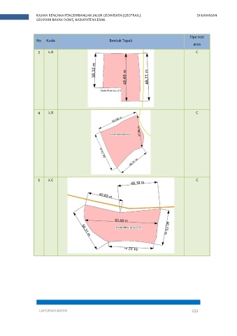 KAJIAN RENCANA PENGEMBANGAN JALUR GEOWISATA (GEOTRAIL) DI KAWASAN GEOPARK BAYAH DOME, KABUPATEN LEBAK. Tipe rest No Kode Bentuk Tapak area 3 2.A C 4 2.B C 5 2.C C LAPORAN AKHIR 232