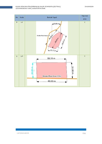 KAJIAN RENCANA PENGEMBANGAN JALUR GEOWISATA (GEOTRAIL) DI KAWASAN GEOPARK BAYAH DOME, KABUPATEN LEBAK. Tipe rest No Kode Bentuk Tapak area 8 2.F C 9 3.A C LAPORAN AKHIR 234