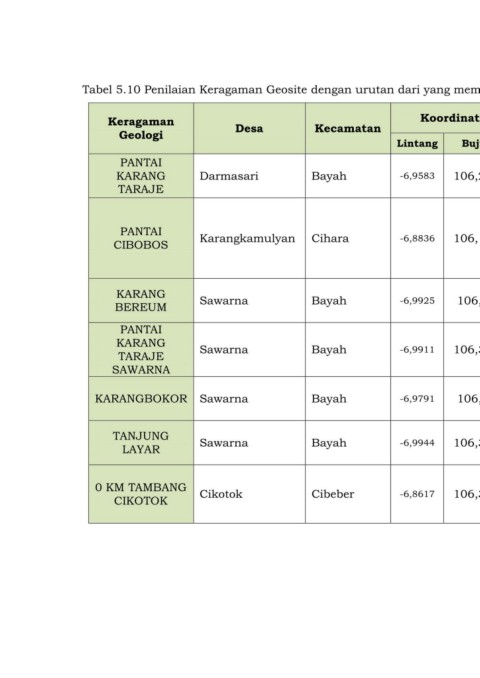 Tabel 5.10 Penilaian Keragaman Geosite dengan urutan dari yang memiliki keragaman Geologi tertinggi