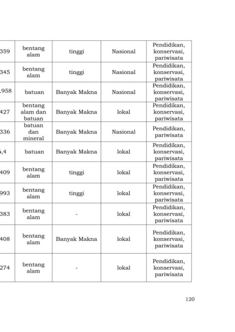 bentang Pendidikan, CURUG TOMO Ciladaeun Lebakgodong -6,6276 106,402 alam dan - lokal konservasi, batuan pariwisata Pendidikan, GUA KARANG Hegarmanah Cibeber bentang Banyak Makna lokal konservasi, TUMPANG -6.7962 106.3658 alam pariwisata 121