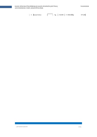 KAJIAN RENCANA PENGEMBANGAN JALUR GEOWISATA (GEOTRAIL) DI KAWASAN GEOPARK BAYAH DOME, KABUPATEN LEBAK. 2 Kawat beton kg 0,0500 17.440,00 Rp 872,00 LAPORAN AKHIR 275